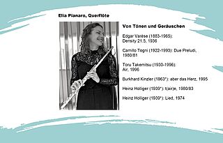 Elia Pianaro, geboren 1994 in Zürich, hat an der Zürcher Hochschule der Künste bei Matthias Ziegler studiert. Kurz nachdem sie 2002 ihren ersten Flötenunterricht erhielt, entdeckte sie die Freude am Zusammenspiel. Diese Freude entwickelte sich, nach den unterschiedlichsten kammermusikalischen Formationen, zu einer ihrer grössten Leidenschaften. 2019 ging Elia ein Jahr nach Mailand ins ‘Conservatorio di Milano Giuseppe Verdi’ um ihre Affinität auf dem Piccolo, der kleinsten Flöte, zu pflegen. Zurück in Zürich schloss sie ihren Master in Pädagogik mit Auszeichnung ab und begann kurz darauf zu unterrichten. Im Augenblick unterrichtet Elia an der Kantonsschule Küsnacht und im Musikverein Niederhasli. Sie tritt als Flötistin bei unterschiedlichen Projekten auf, wobei ihr Fokus auf zeitgenössischer Musik liegt.