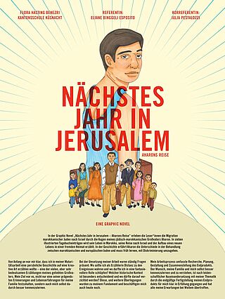 In der Graphic Novel "Nächstes Jahr in Jerusalem – Aharons Reise" wird den Leser*innen das Thema der Migration marokkanischer Juden nach Israel durch die Augen meines jüdisch-marokkanischen Grossvaters Aharon nähergebracht. In sieben illustrierten Tagebucheinträgen, geschrieben aus der Perspektive des immer älter werdenden Aharon, werden Einblicke in sein Leben in Marokko, seine tumultuöse Reise nach Israel und den langen, anstrengenden Aufbau eines neuen Lebens in einer fremden Heimat geschaffen. Durch die Erlebnisse seiner Reise wird ihm bald bewusst, dass er als marokkanischer Jude nicht gleich behandelt wird wie europäische Juden. Er muss früh lernen, mit Diskriminierung umzugehen, und muss erkennen, dass er und seinesgleichen sich im Verlauf ihres Lebens immer doppelt so oft beweisen und doppelt so sehr bemühen müssen.