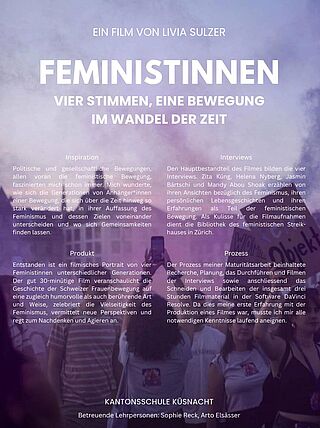 Die feministische Bewegung befindet sich seit ihren Ursprüngen im stetigen Wandel. Viele ihrer Forderungen wurden über die Jahre hinweg umgesetzt, für etliche Anliegen kämpfen Feminist*innen seit Jahrzehnten erfolglos und zahlreiche neue Themen kommen immer wieder dazu. Mich wunderte, wie sich die Generationen von Anhänger*innen einer Bewegung, die sich über die Zeit hinweg so stark verändert hat, in ihrer Auffassung des Feminismus und dessen Zielen voneinander unterscheiden und wo sich – trotz einer zunehmenden Spaltung zwischen älteren und jüngeren Feminist*innen – Gemeinsamkeiten finden lassen. Dies versucht der entstandene Film anhand eines Portraits von vier Frauen aus unterschiedlichen Generationen zu erfassen. Mandy Abou Shoak, Helena Nyberg, Jasmin Bärtschi und Zita Küng erzählen während einer guten halben Stunde von ihren Ansichten, Lebensgeschichten und Erfahrungen als Teil der feministischen Bewegung und zeigen so die Vielseitigkeit des Feminismus auf.