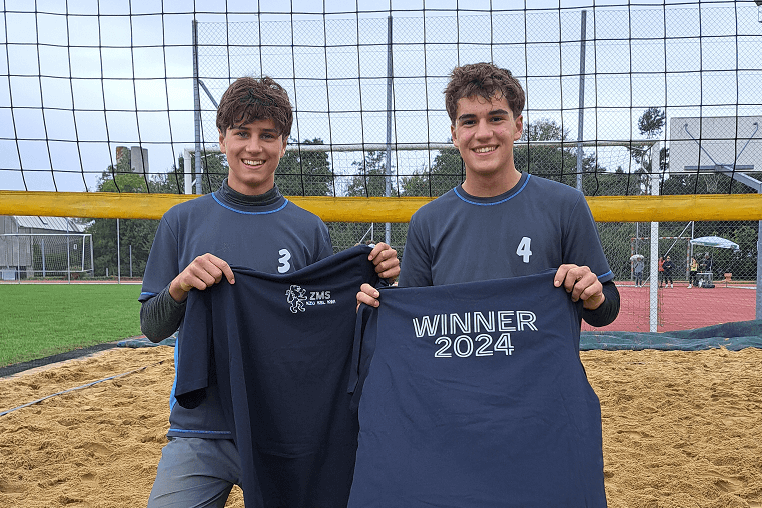 Stolzes Gewinnerduo im Beach Volleyball am Züricher Mittelschulsporttag 2024 an der Kantonsschule Zürcher Unterland in Bülach: mit dem überzeugenden Auftritt von Ramin und Kian Matter (4e resp. 5d) geht der Sieg dieses Jahr nach Küsnacht. Herzlichen Glückwunsch!