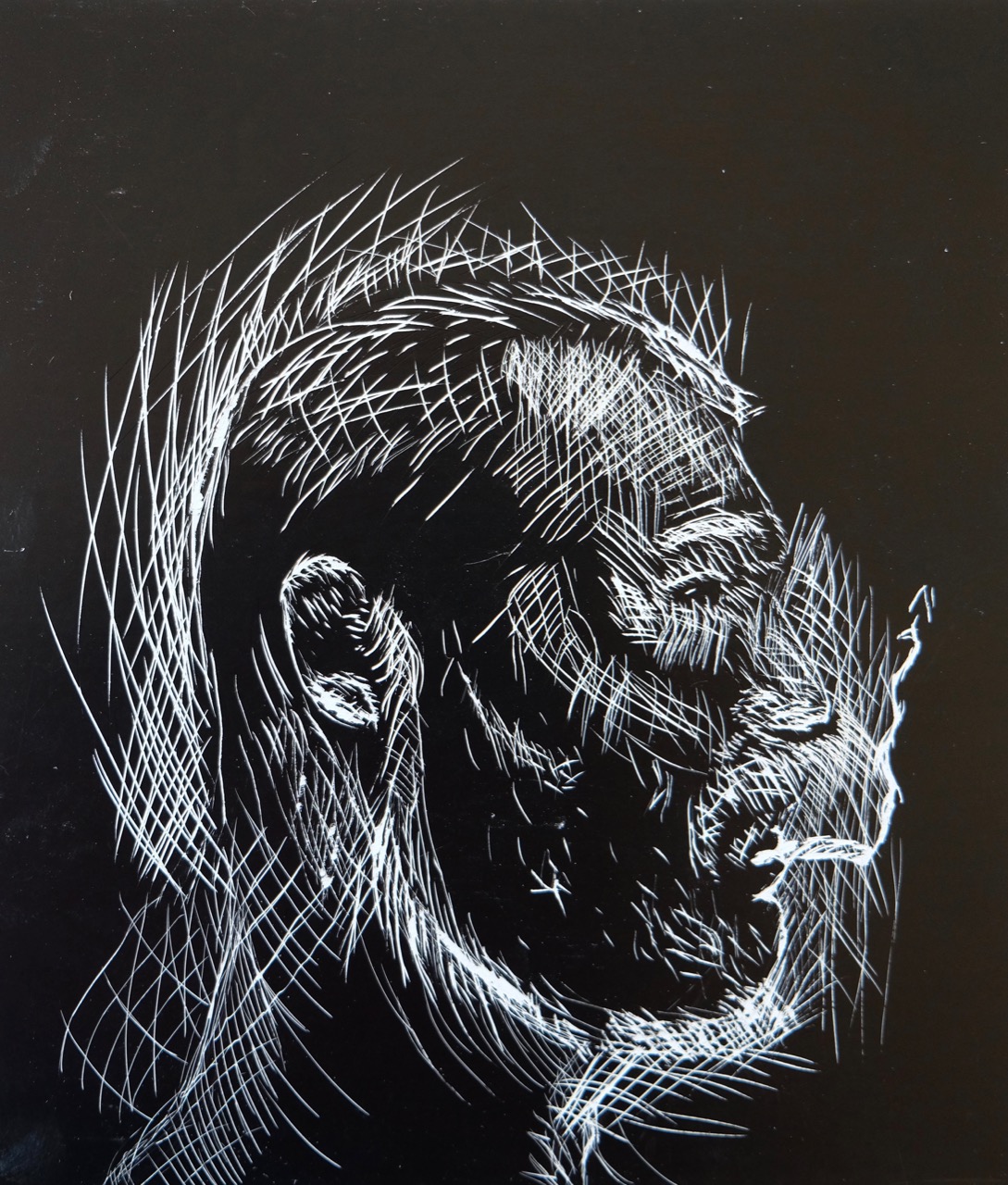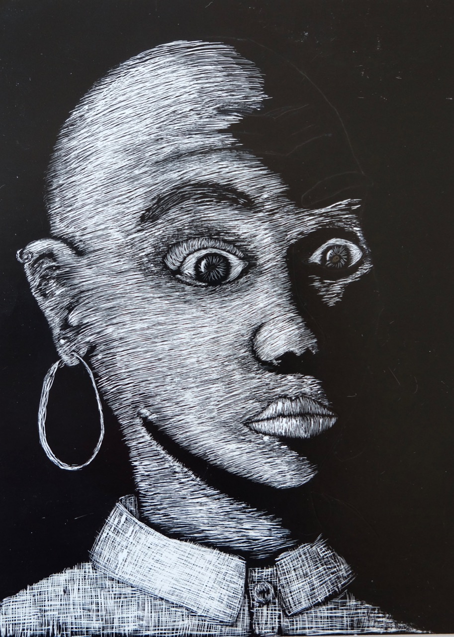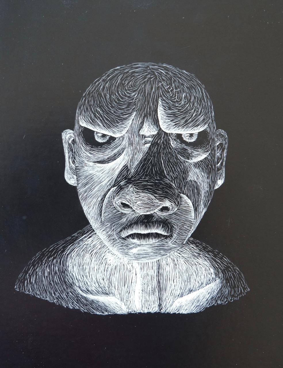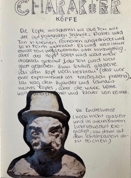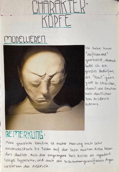 Die Klasse 4a modellierte Charakterköpfe zu einer selbst erprobten Mimik. Die Köpfe wurden gezielt beleuchtet, fotografiert und anschliessend auf Schabkarton gezeichnet. Während der Umsetzungen konnten sich Mimik und Gesichtszüge laufend verändern.