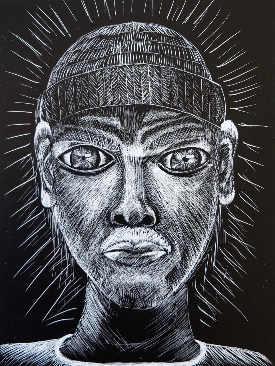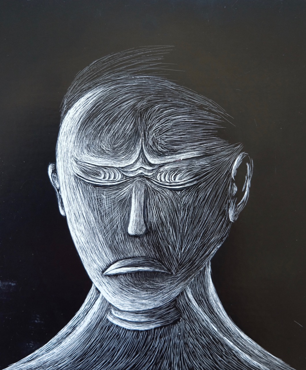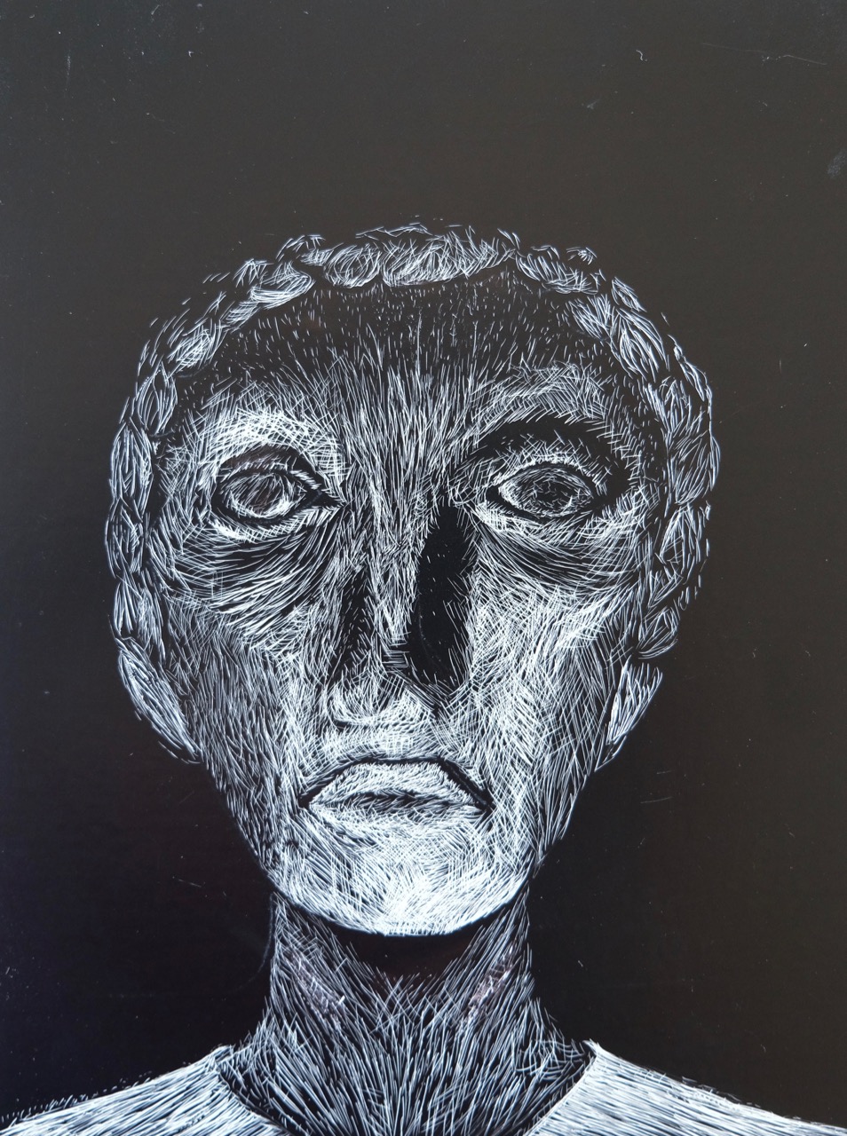 Die Klasse 4a modellierte Charakterköpfe zu einer selbst erprobten Mimik. Die Köpfe wurden gezielt beleuchtet, fotografiert und anschliessend auf Schabkarton gezeichnet. Während der Umsetzungen konnten sich Mimik und Gesichtszüge laufend verändern.